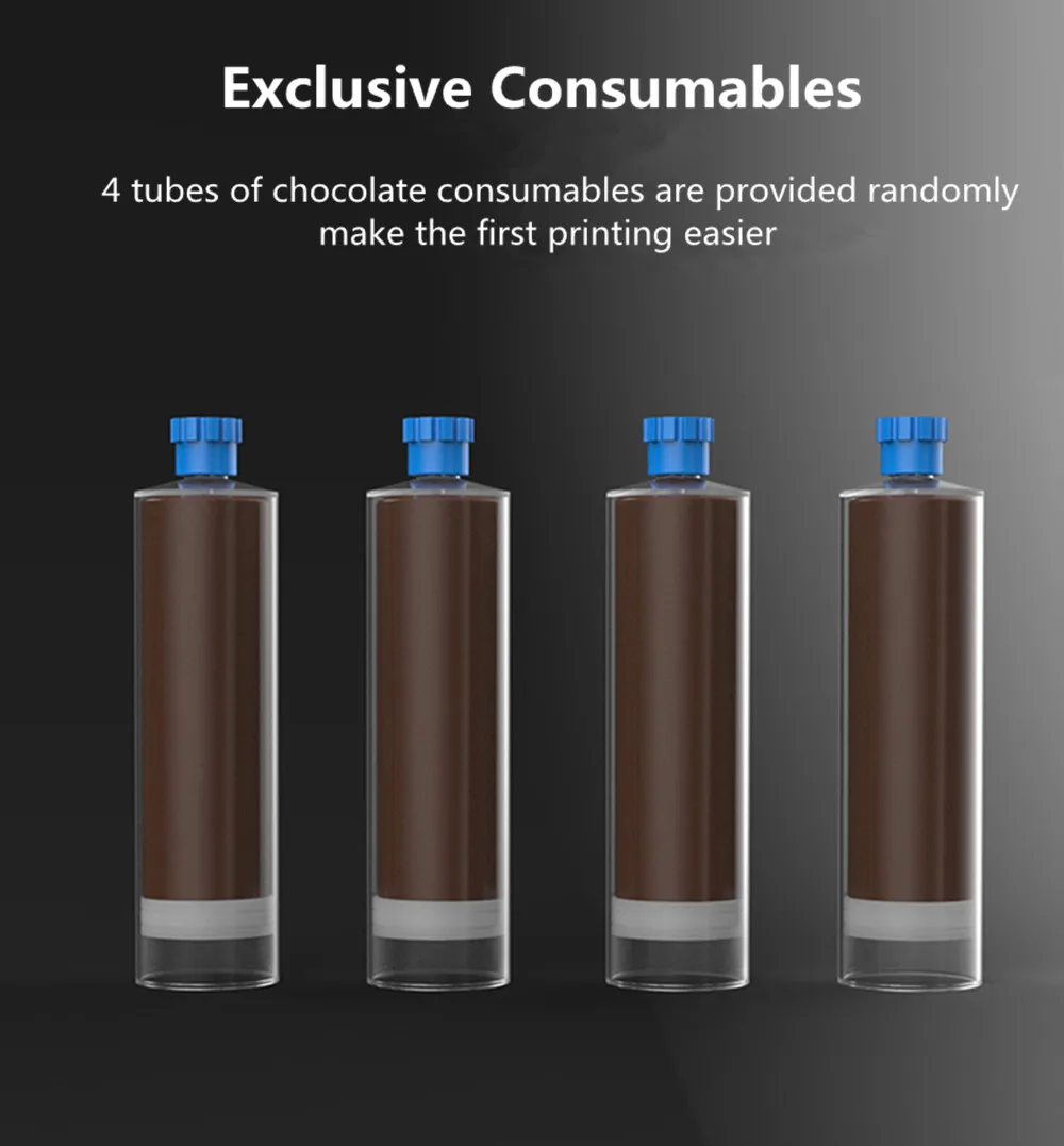 Printing materials: pure fat chocolate, fat substitute chocolate, rare earth refried beans, cream, salad dressing, ketchup, blueberry sauce, etc.